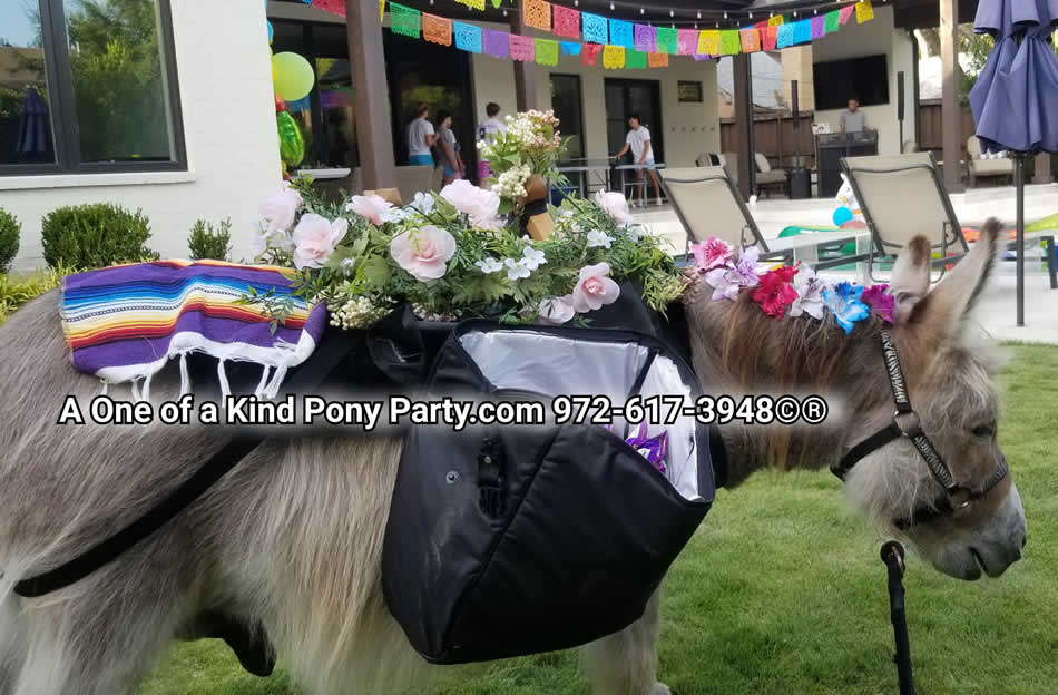 Our Fiesta Miniature Donkey comes with a festive blanket and flowers in the mane and tail.